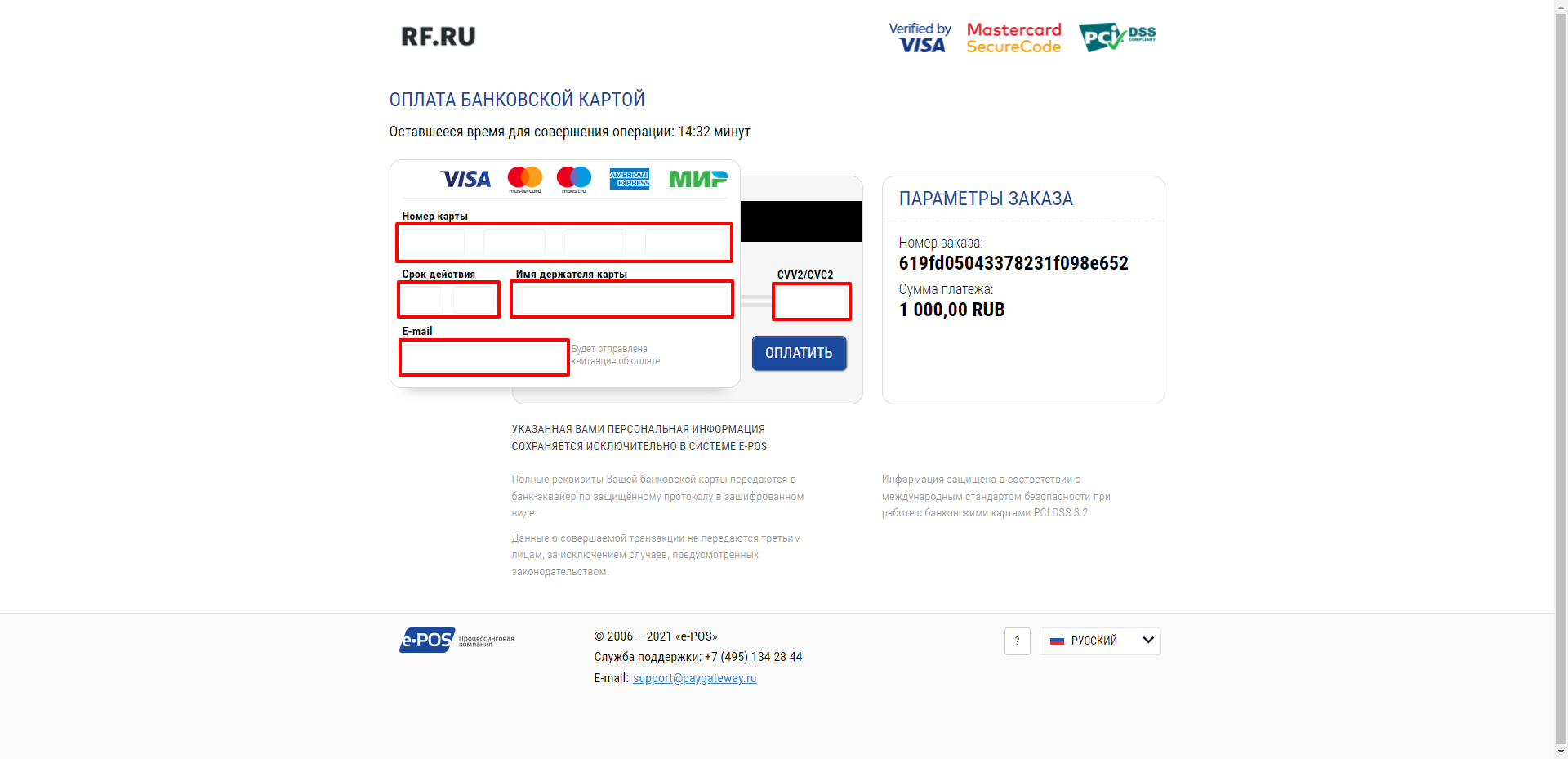 - На открывшейся странице укажите реквизиты банковской карты, с которой собираетесь оплатить заказ: