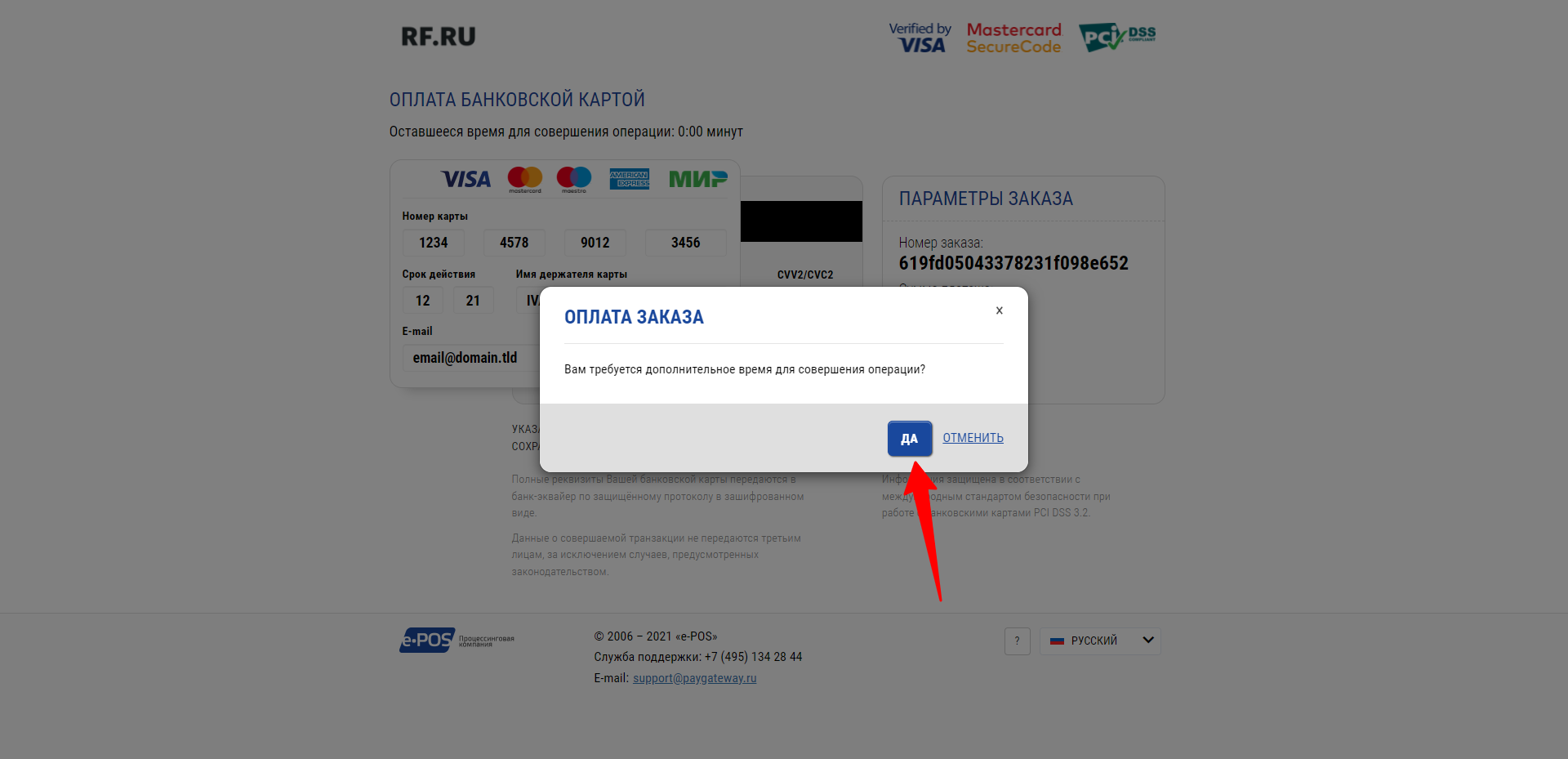 - Для проведения сессии оплаты система дает 15 минут. Если вам не хватает отведенного периода, по его истечении появится всплывающее окно с вопросом, нужно ли вам дополнительное время, где вы можете нажать кнопку Да для продления сессии (или Отменить для ее отмены).
