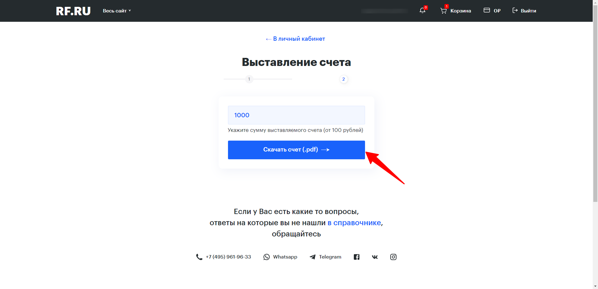 - Появится кнопка Скачать счет (.pdf) - нажмите на нее, чтобы загрузить документ со счетом в формате pdf.