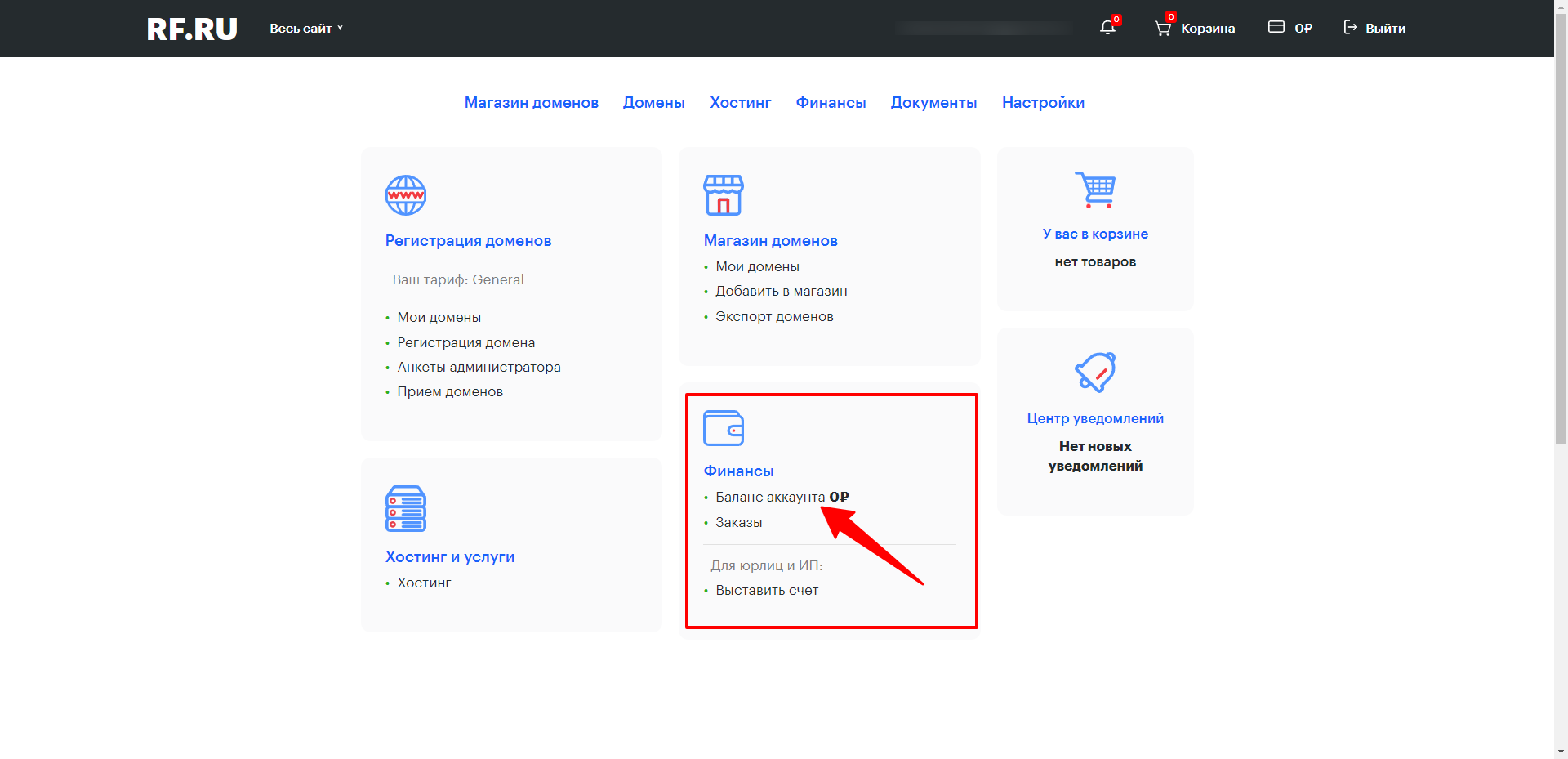 - На главной странице личного кабинета найдите раздел Финансы и нажмите на пункт Баланс аккаунта.