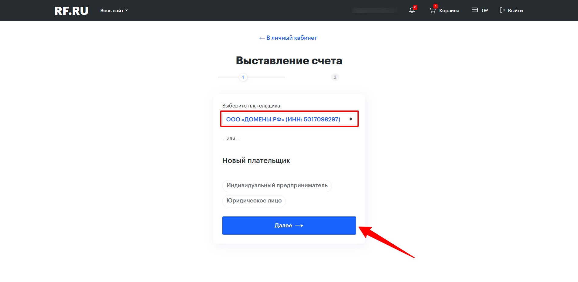 - Страница перезагрузится и вы увидите только что созданный профиль в выпадающем списке Выберите плательщика - чтобы развернуть его нажмите на строку с именем профиля (если ранее вы создавали другие профили для безналичной оплаты, они также отобразятся в выпадающем списке). Нажмите кнопку Далее.